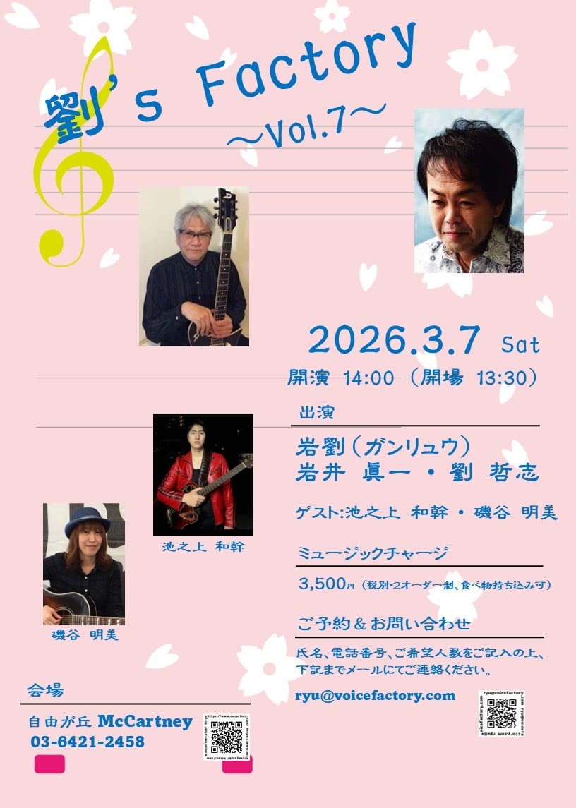 【チケット料金】¥7.000 ドリンク代(ワンオーダー制)・お食事代別途
